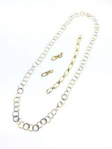 Collar extra largo de eslabones de oro blanco y amarillo. Además, pulsera de eslabones irregulares de oro amarillo y pendientes cortos de oro amarillo, también de eslabones