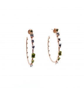 Pendientes tipo aro abierto también de plata rosa con topacios azules y olivinas