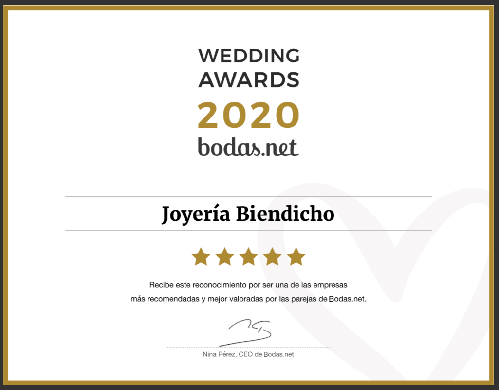 Joyería Biendicho ha recibido el premio Wedding Awards 2020, en un año complicado para las bodas hasta el momento debido al COVID19. Se trata del galardón más prestigioso de las bodas, para la categoría Joyería. Desde hace siete años, Bodas.net otorga estos premios a la excelencia en el servicio ofrecido por las empresas del sector nupcial de nuestro país, pero son las parejas las que lo hacen posible gracias a sus opiniones tras haber disfrutado de los servicios de los profesionales en sus bodas. Este premio se ha convertido en un referente en el sector y un sello de garantía para las parejas que organizan su boda a la hora de elegir proveedores para su gran día.